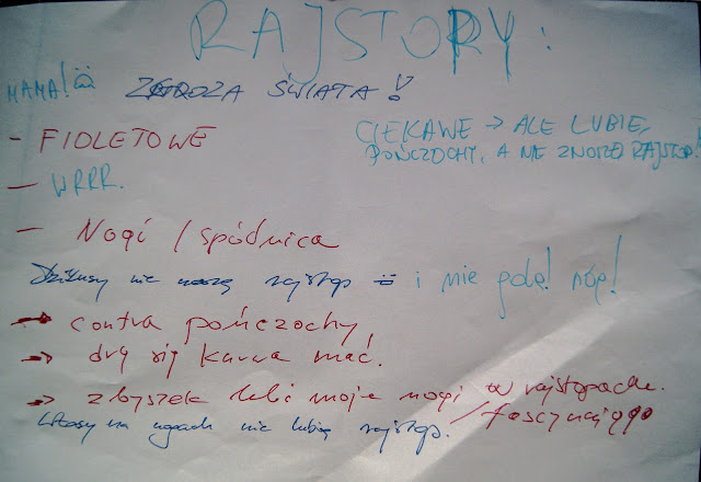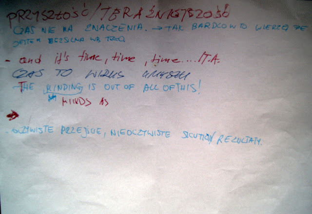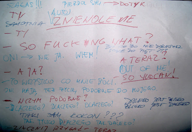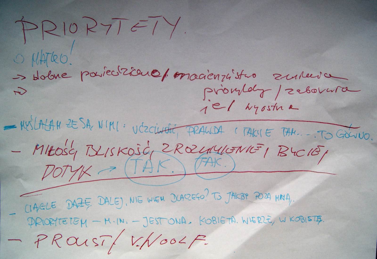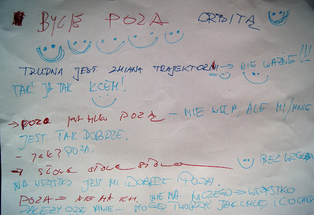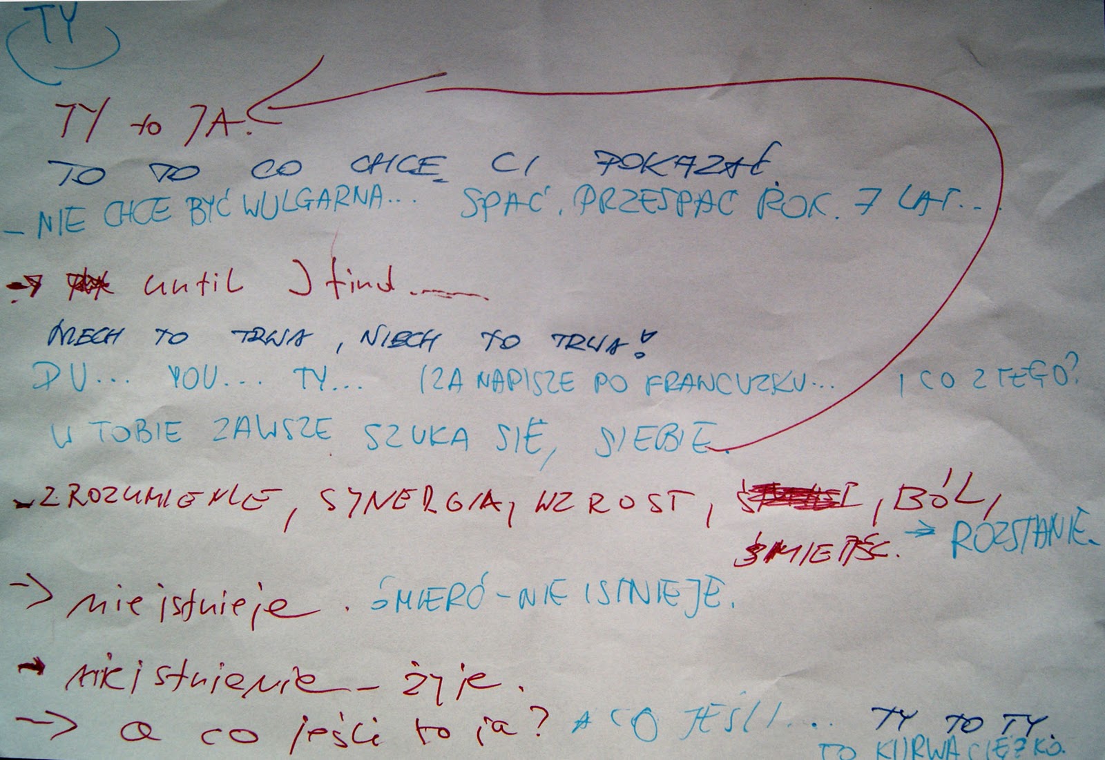 Wyłożyłam pierwszą kartkę i poprosiłam, abyśmy spontanicznie zapisywały słowa i zdania, które kojarzą nam się z danym hasłem, rysowały, darły jeśli trzeba... potem kartę wyłożyła Iza Bella, a następnie Beata. Każdą kolejną zapisywałyśmy prawie bez rozmowy. Wszystko zaczęło przebiegać w ciszy, z wyraźną dynamiką, w westchnieniach, uśmiechach, ekspresji towarzyszącej naszym wewnętrznym przeżyciom, ciekawości i chęci wczucia się w drugą osobę. Stworzyłyśmy dialog bez słów, który przerodził się w szczerą, dogłębną i długą rozmowę.